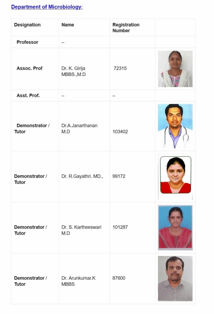 Demonstrator/Tutor | Dr. Precila infant vincy M.D | 92475 |